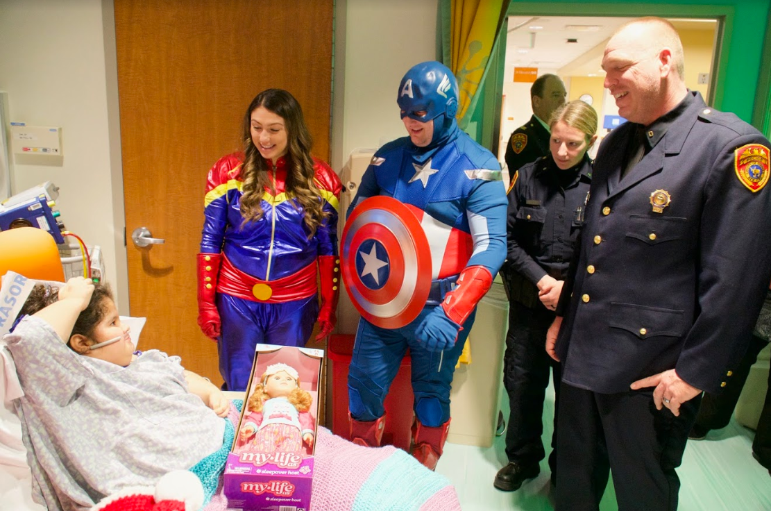 John Skippon, police operations aide, dressed up as Captain America, while detective Jennifer Fortunato donned a Captain Marvel outfit. Other officers joined them, delivering presents to the children.