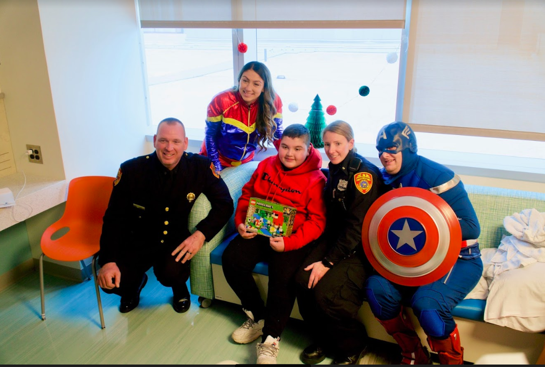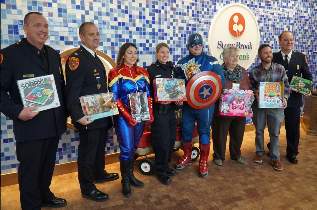 STONY BROOK, NY — Patients at Stony Brook Children’s Hospital got a nice surprise and special holiday delivery Friday afternoon. Members of the Suffolk County Police Department’s Sixth Precinct Cops Who Care paid them a visit in superhero garb.