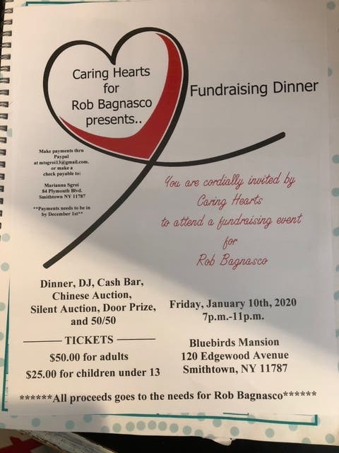 A fundraising dinner is being presented by Caring Hearts for Rob Bagnasco and is scheduled for Friday. It will run from 7 p.m. to 11 p.m. at Bluebirds Mansion at 120 Edgewood Ave., Smithtown. Tickets are $50 for adults and $25 for children under 13. More information is posted on the flyer below.