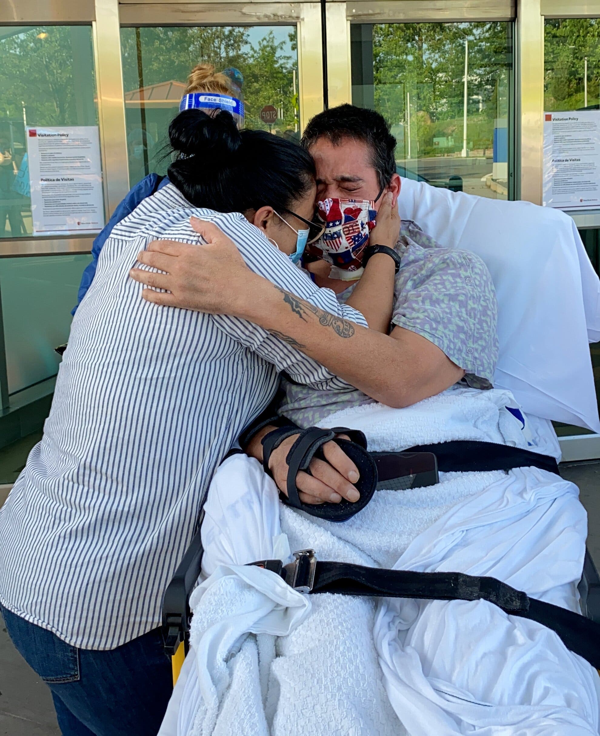 Gary Degrijze sees his wife, Ana, for the first time in over two months. He was admitted into Stony Brook University Hospital on March 22 and discharged on June 5. (Video credit: Stony Brook Medicine)