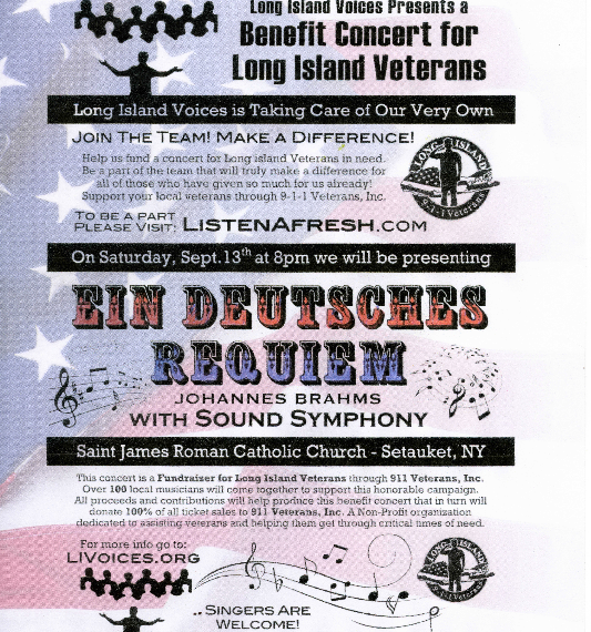 The concert will feature the choral masterwork, Brahms’ “German Requiem” along with several original pieces composed by musical director, Michael Bussewitz-Quarm. Tickets are available online at https://www.eventbrite.com/e/long-island-voices-presents-brahms-german-requiem-for-911-veterans-benefit-tickets-12415869199. Tickets will also be available at the door. Suggested ticket price is $20, but all donations are gratefully accepted.