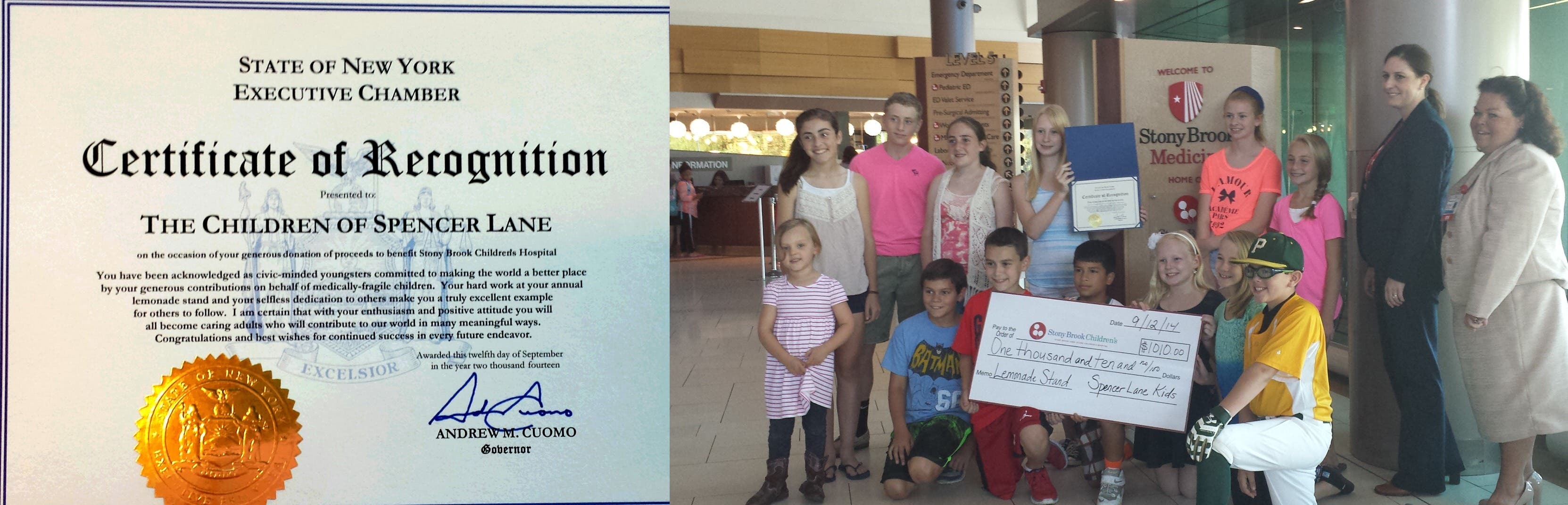 Last Friday, Kids of Spencer Lane and their friends, presented a check to the Stony Brook Children’s Hospital with the proceeds they earned from their lemonade stand last month.