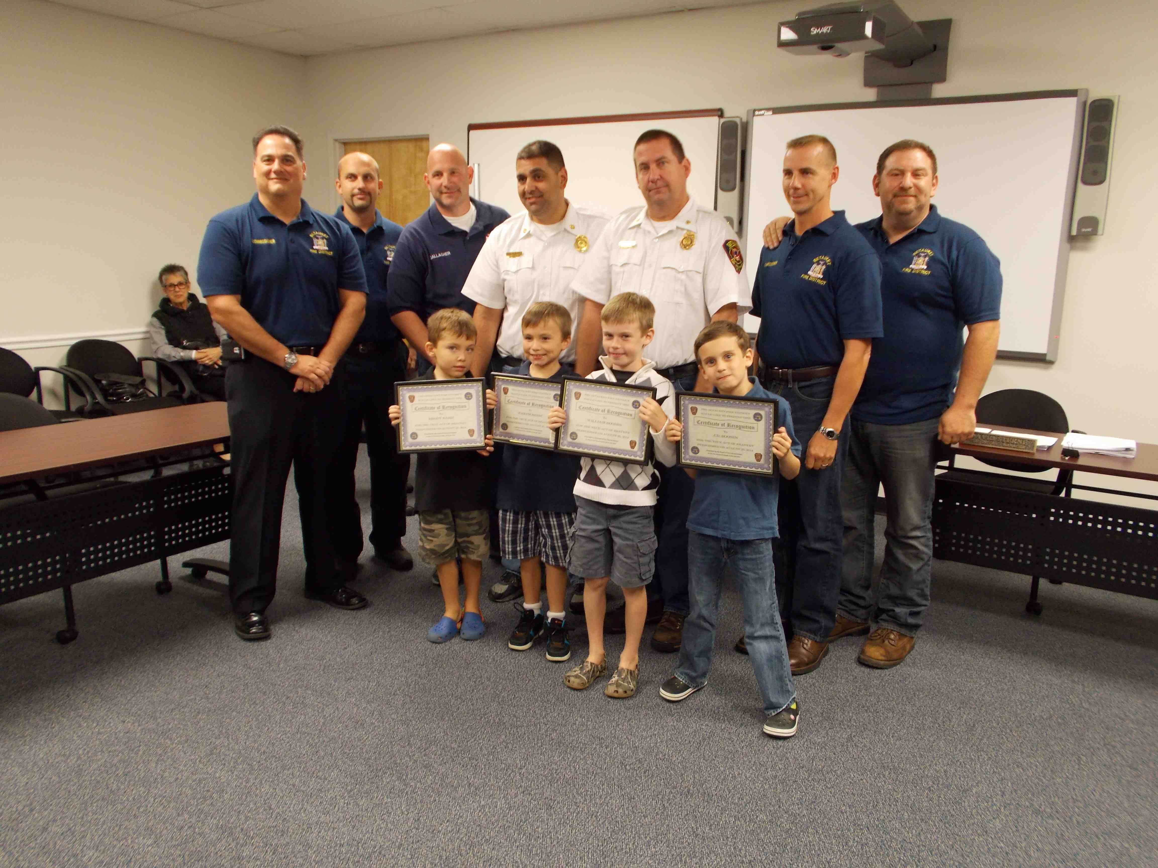 Photo Caption: Front row, left to right: Brody Babis, Joseph Babis, William Boonin and JD Boonin are honored by members of the Setauket Fire Department and commissioners from the Setauket Fire District for their quick actions in response to a fire in late August.