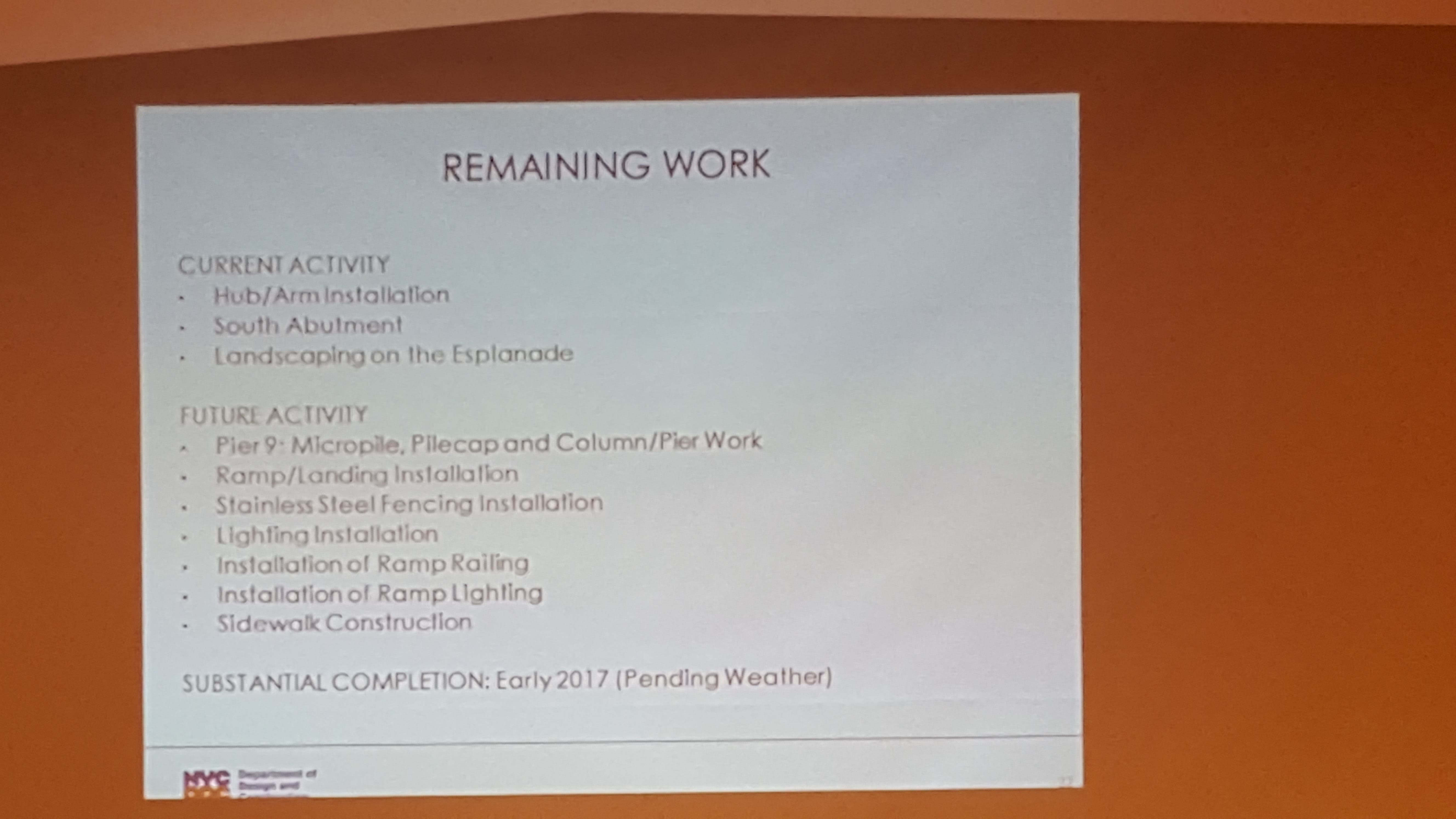 The city has begun resuming construction on the East 81st Street Pedestrian Bridge after it had apparently stalled during the summer. The project is almost complete, according to Esposito Bernard, and there are just a few more tasks left to complete.