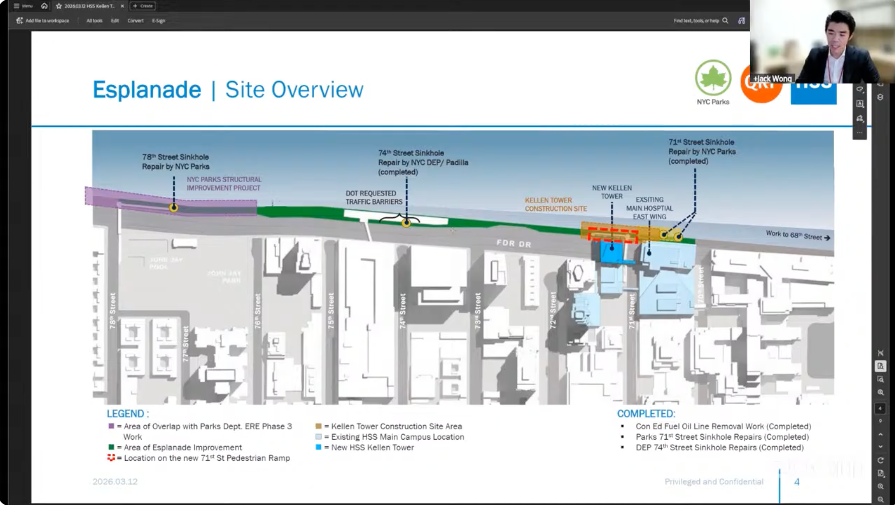 Jack Wong, a project manager for HSS's Esplanade renovations, told Community Board 8 that the stretch between East 70th Street and East 72nd Street will be opening back up for pedestrian use within the next two weeks, following a final walk-through with city officials scheduled for Tuesday.