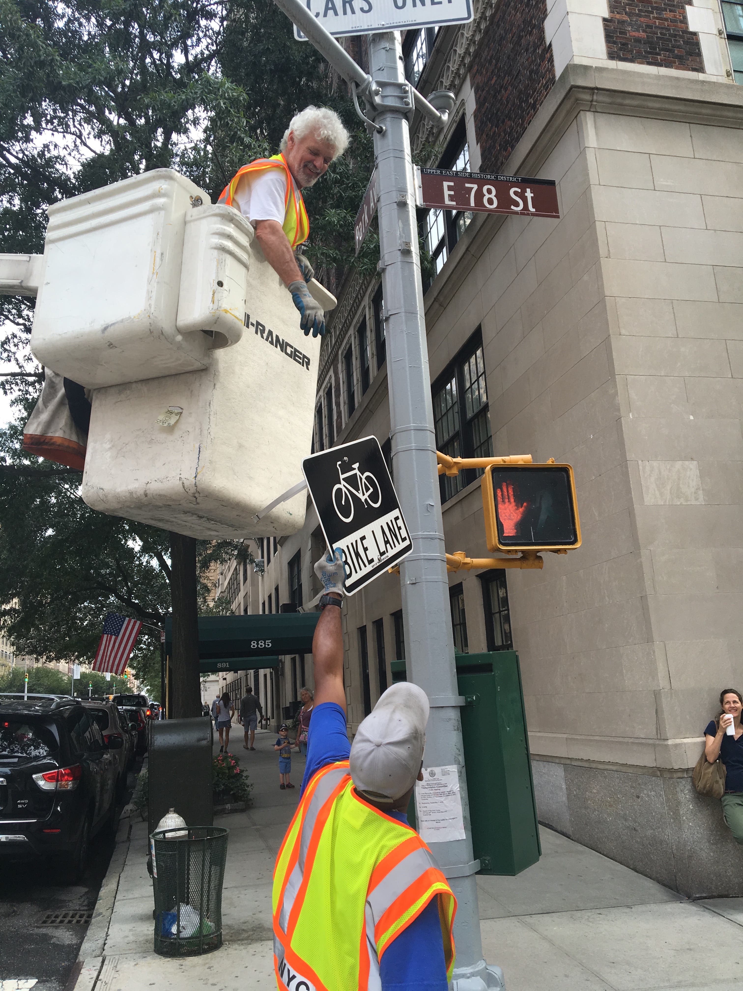 UPPER EAST SIDE, NY — The Department of Transportation announced that it would install crosstown bike lanes on the Upper East Side this summer, and a photo taken Friday shows workers putting up signage for the East 78th Street bike lane.