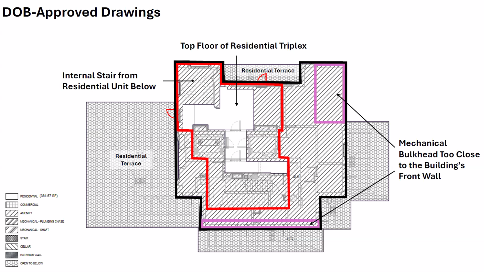 Plans filed with the city's Department of Buildings show the disputed level includes the apartment's top floor space, an internal staircase and access to large terraces, and is listed as part of the triplex penthouse.
