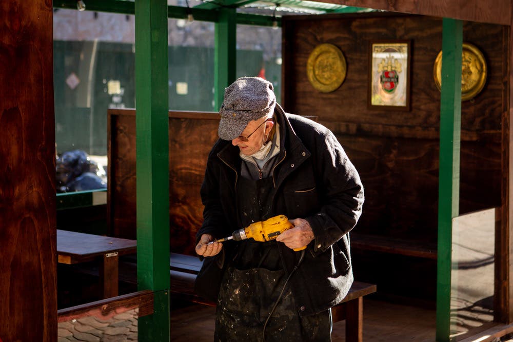 Even after Jimmy hired someone else to build the bar’s new outdoor dining setup—one spacious central stall, flanked by two others, all with dark-stained wooden tables and high-backed benches—Stoney can still be found making his own finishing touches.