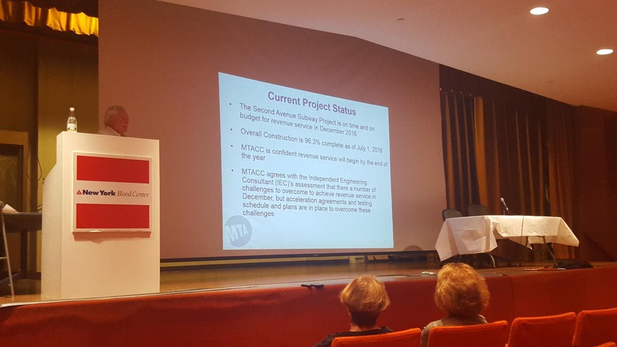 Tom Peyton, director of construction for the project, said that the construction was on-budget and on-time during a Thursday night meeting of Community Board 8's 2nd Ave Subway Task Force. Peyton said that work on phase 1 of the plan — construction of new Q train stops at 96th, 86th, and 72nd street stations and connecting the Q to the existing 63rd Street station — will be completed by October and the line will be running by December. As of July 1, 96.3 percent of the project had been completed.
