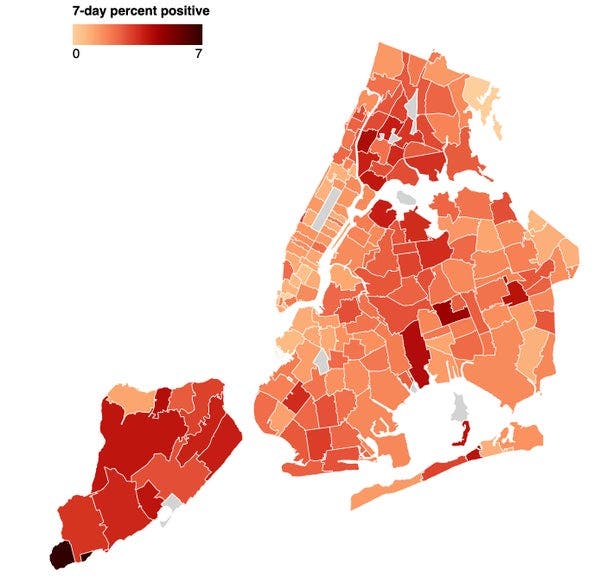 The data, which shows COVID-19 testing results for every New York City ZIP code between Oct. 31 and Nov. 6, shows a citywide increase in the percentage of coronavirus tests coming back positive, fueling fears that a second wave may be imminent — or has already arrived.