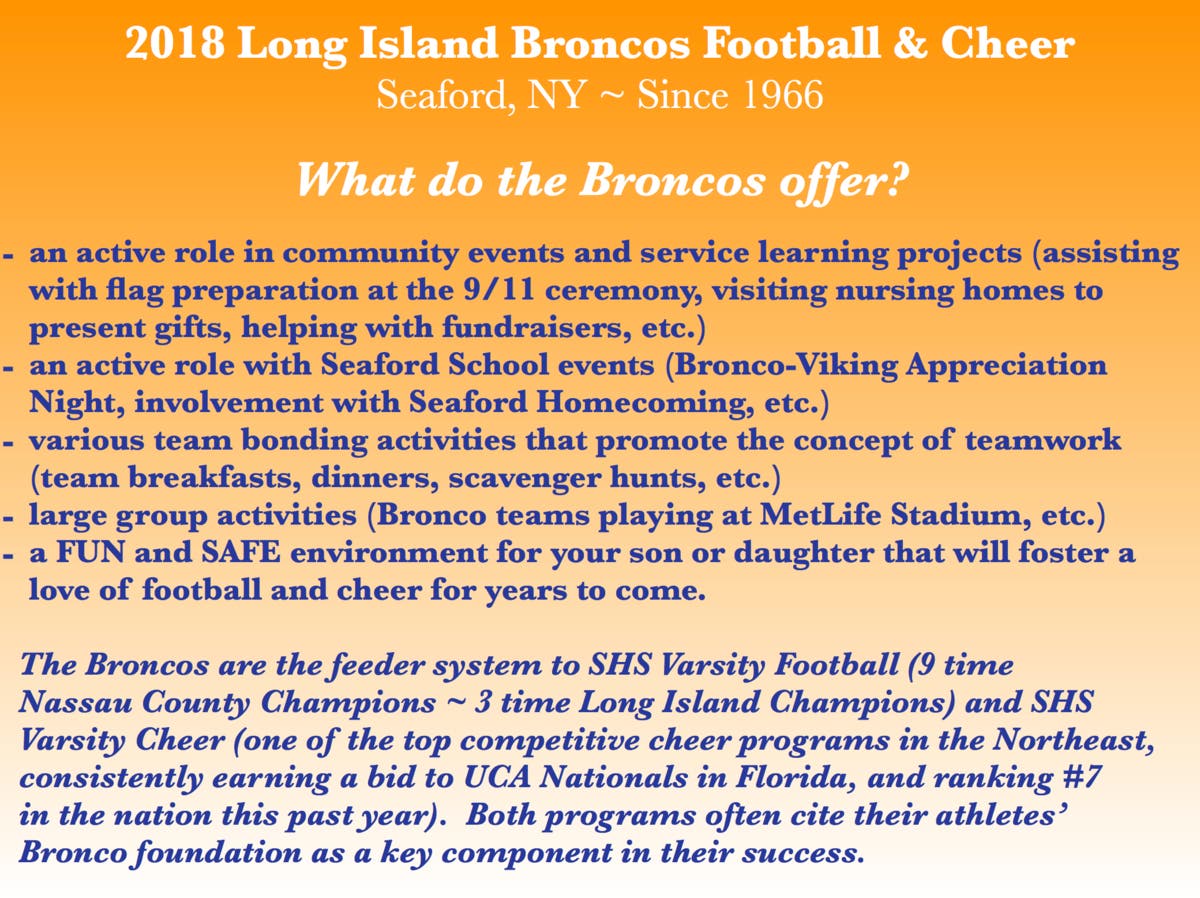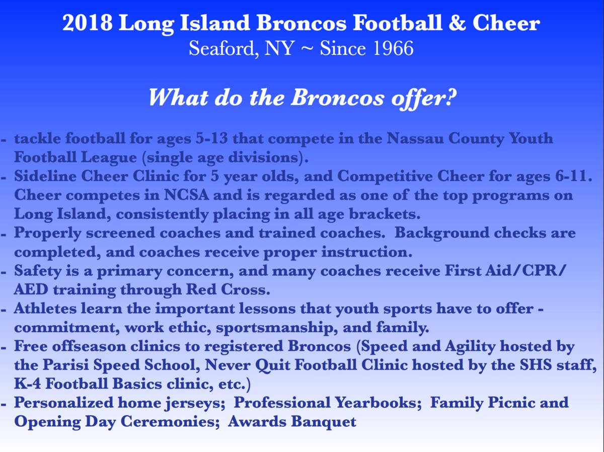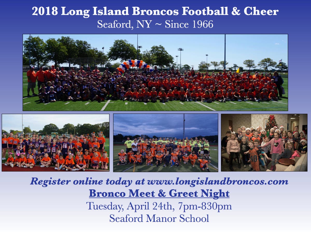 The Long Island Broncos Football and Cheerleading Organization is based in Seaford and was established in 1966. Our goal is, and always has been, to create a safe environment for our children to learn the fundamentals of football and cheerleading, along with the importance of good sportsmanship and being a team player. More than anything else, we want our kids to have fun on the football field and cheer mat, and to foster a love for the game. We are looking forward to another great season, and we will once again be offering free offseason clinics to registered Broncos (K-4 Football Basics, Parisi Speed and Agility, Viking-Bronco Never Quit Football Clinic, etc.), providing our coaches with proper training, including CPR/First Aid/AED certifications, and making sure our Broncos are involved with various community events and service learning opportunities, all while learning the many important lessons that youth sports have to offer, including commitment, work ethic, sportsmanship, and family. Online registration is currently open on our website, and there are several payment options including online installment payments. There will also be a Bronco Meet and Greet Night on April 24th for anyone new to the Broncos who would like to come down and talk to Bronco representatives.
