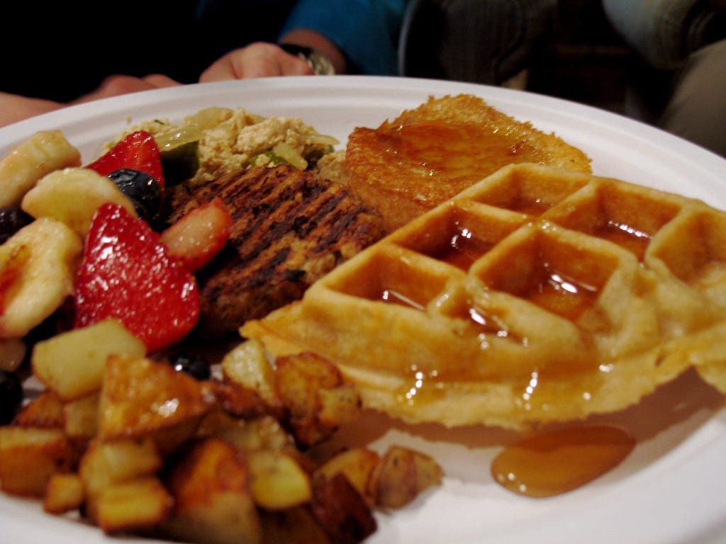 We have a Waffle Station, Egg/Omelette Station, Salad Station, Fritatta’s, Sausage & Peppers, Bacon/Sausage, Shrimp, Meatballs in a Sweet Marinara Sauce, Mozzarella Cardozza, Fresh Fruit and Fresh Bagels…to name a few. You have a choice of One Beverage (Bellini, Mimosa, Bloody Mary, Espresso or Cappucino) and then the Brunch begins. All of this plus Coffee, Tea, Orange Juice and Home Made Desserts for $19.95 per Person; $9.95 for Children. All desserts are made by Little Nibbles.