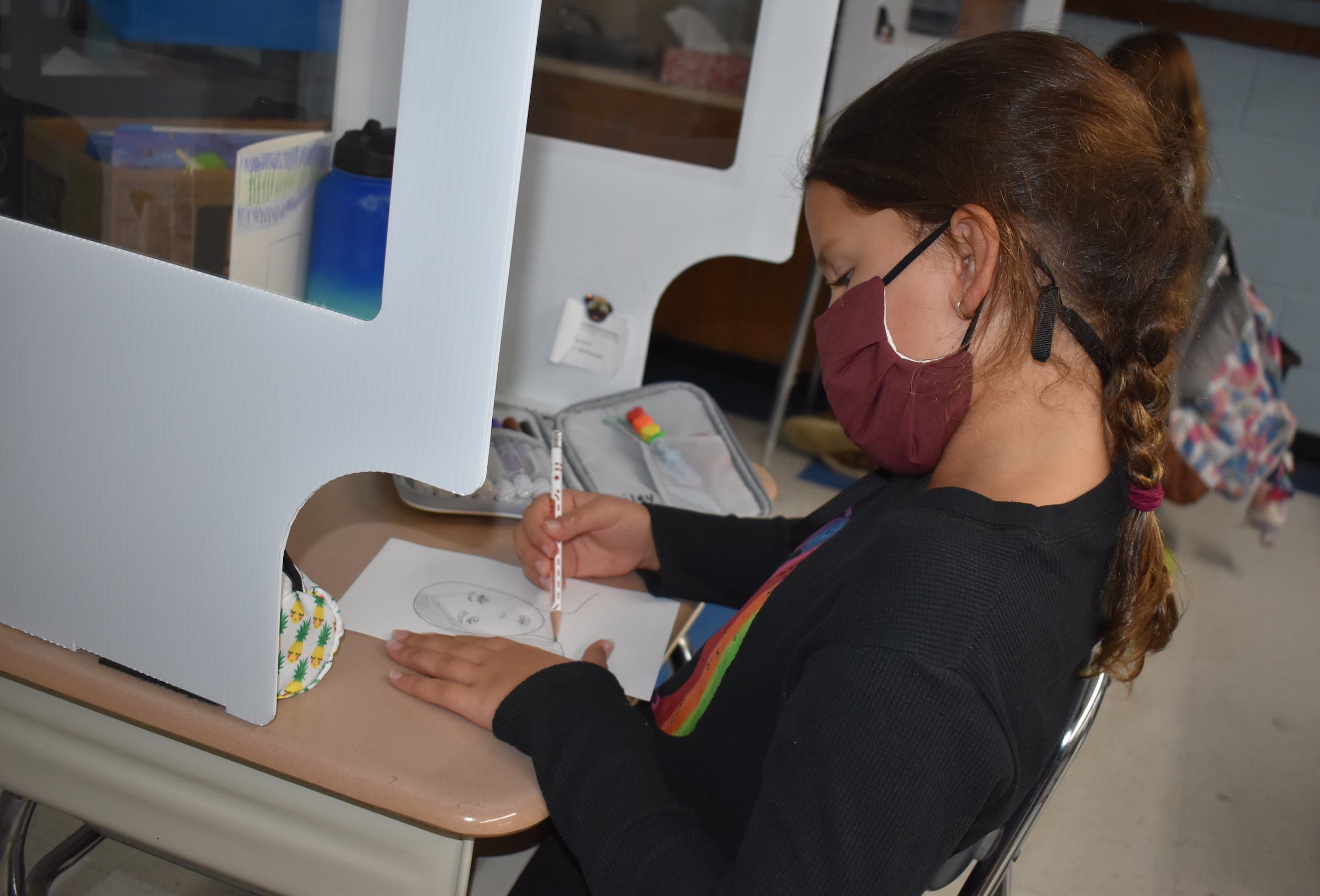Christine Donnelly, whose studio-style art room had stations with different materials, now teaches art in the classrooms. She has created projects based on the supplies students readily have in their desks, such as crayons, glue sticks, pencils and scissors, and provides them with blank paper.