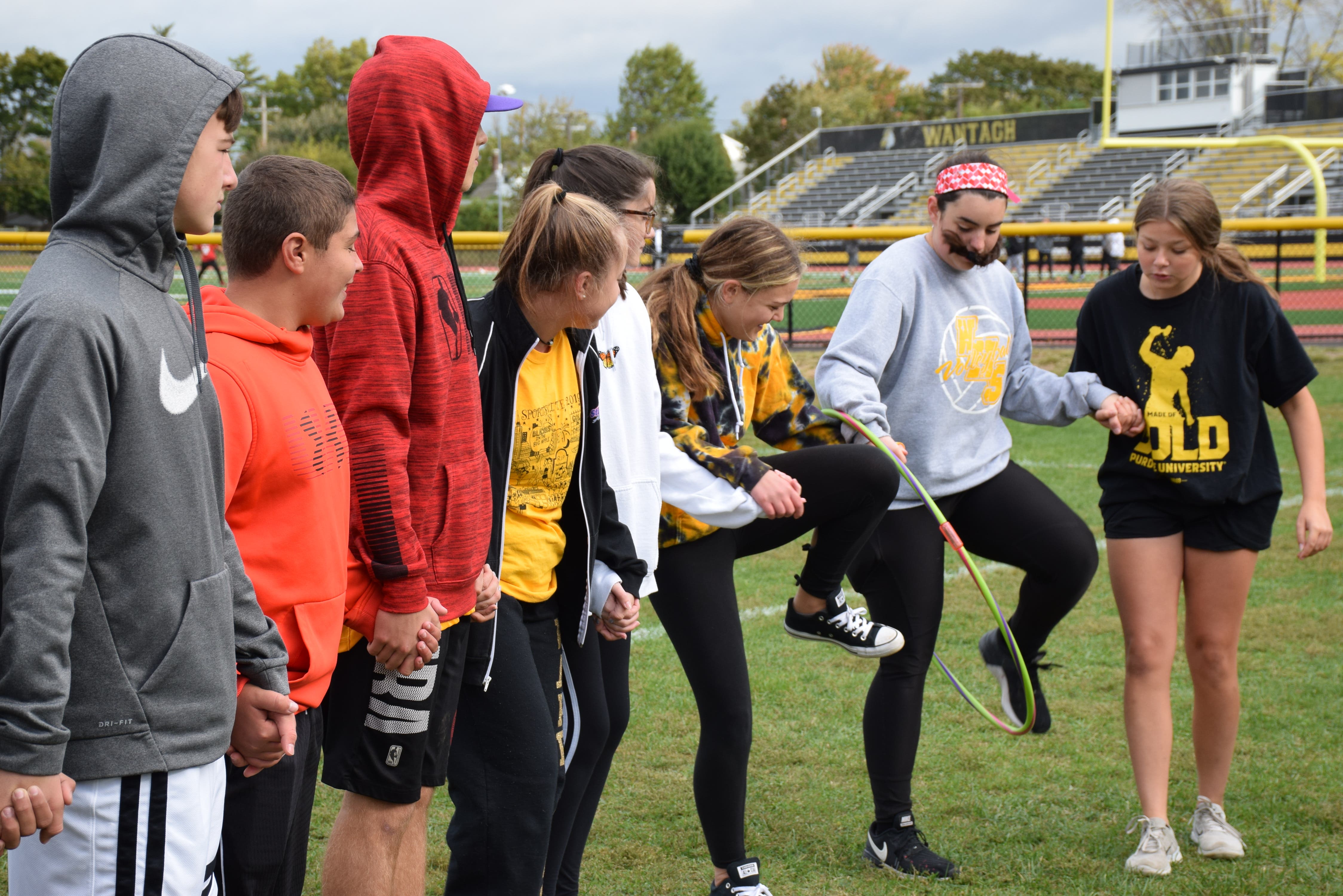 WANTAGH, NY — Wantagh High School freshmen ditched the classrooms for a day to participate in the second annual Freshman Field Day. Ninth graders on Thursday took to the field and tennis courts, cycling through eight team-building activities including Hang the Laundry, All Dressed Up, Find Your Footwear, Hula Your Hoop and more.