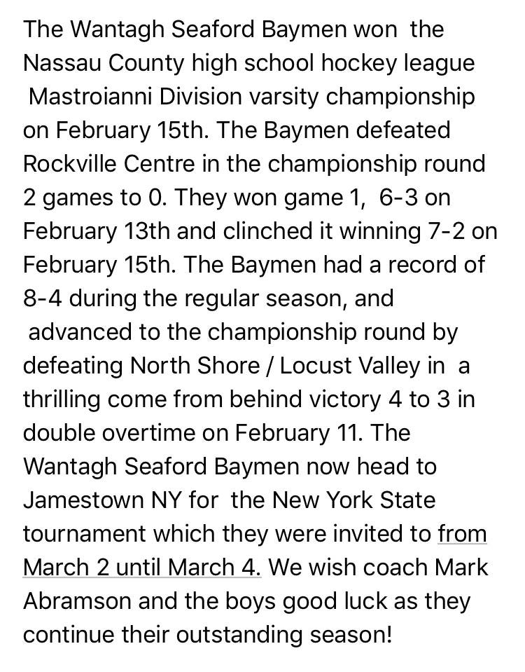 Wantagh Seaford Baymen win Nassau County High School Hockey league Mastroianni Division Championship!