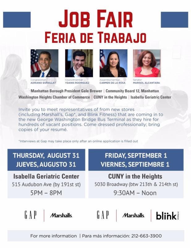 WASHINGTON HEIGHTS-INWOOD, NY — Three big-name retailers moving into the retail concourse of the renovated George Washington Bridge bus terminal will hold job fairs this week in Washington Heights and Inwood.