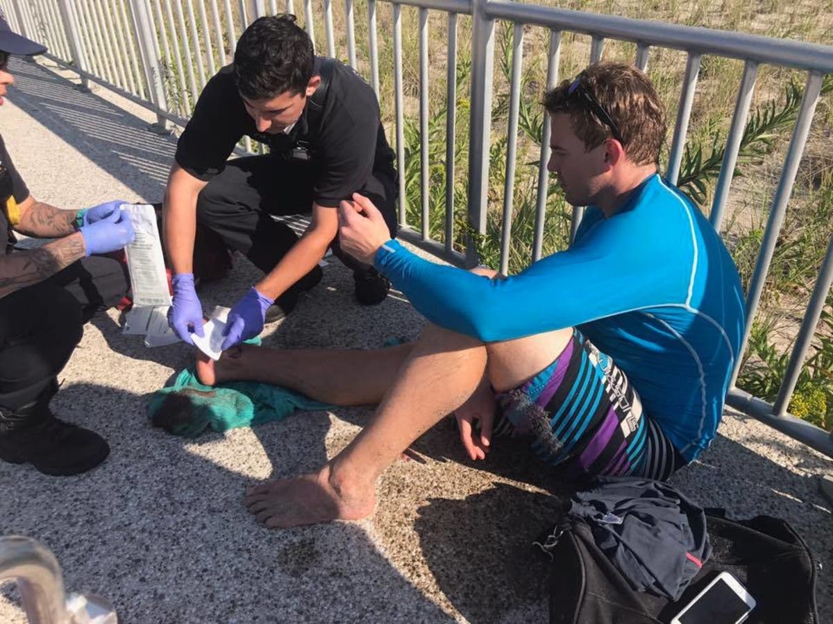 Paramedics responded to the Rockaway Boardwalk at Beach 96th Street to treat Behrend at 3:36 p.m. before taking him to Jamaica Hospital in Queens, an FDNY spokesman said. The FDNY was unable to confirm whether the cuts on Behrend's foot came from a shark bite.