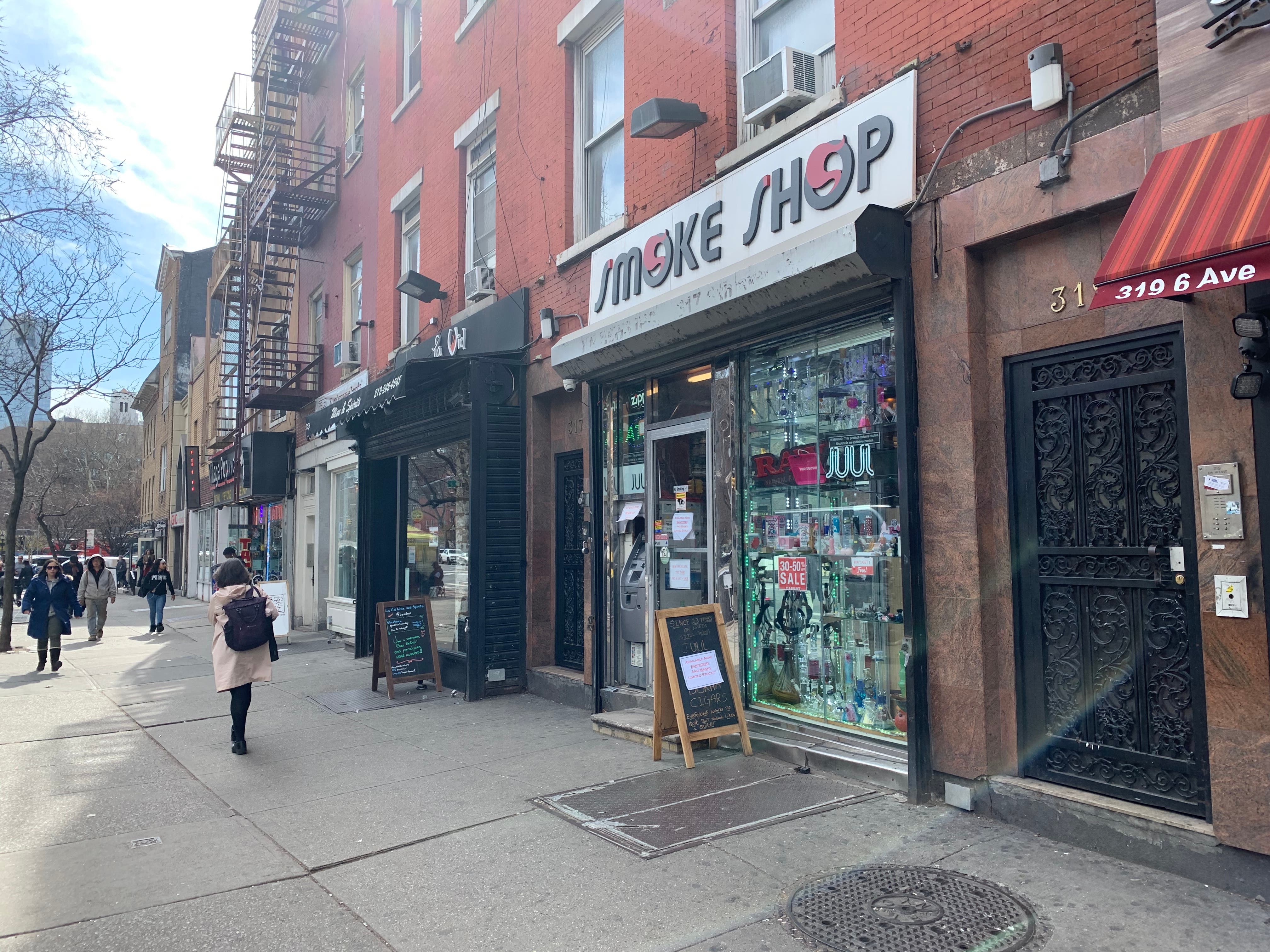(Anna Quinn/Patch). Sixth Avenue Smoke Shop advertises its hand sanitizer and mask supply in the windows.