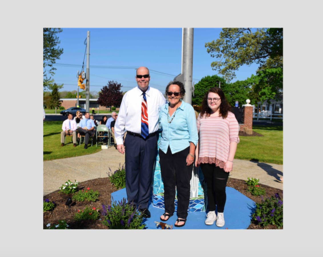 The memorial, which sits at the base of the school’s flagpole, was designed by Westhampton Beach High School eighth-grader Gianna Gattuso with the assistance of area artist Clare Bennett and middle school art teacher Lise Frielinghaus, who passed away earlier this year, the district said.