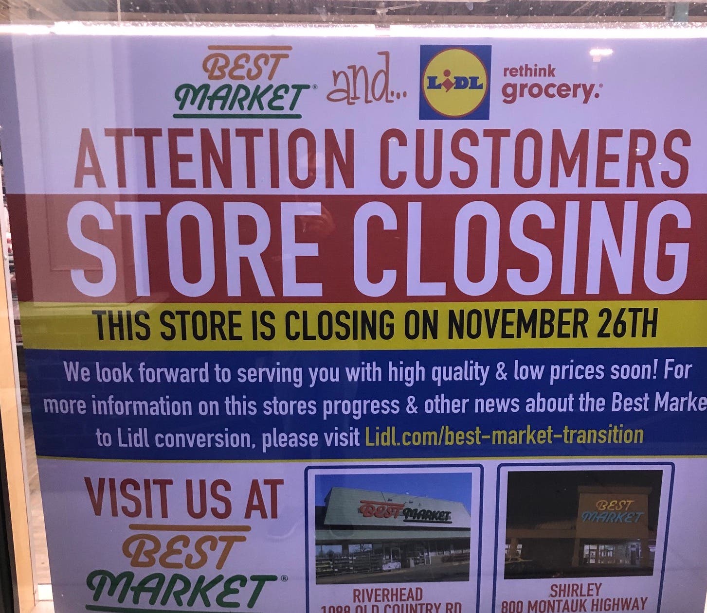 According to Best Market and Lidl, the Westhampton location will close on Nov. 26. According to Westhampton Beach Village Mayor Maria Moore, the Sunset Ave. supermarket will be closed for five to six months for interior renovations.