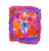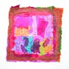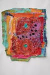 Koener mostly paints on cotton fabrics and handmade papers. She uses tempera paint, pastels and ink to make her art. Paintings are not planned beforehand—she paints, cuts into pieces and then collages to create her paintings.