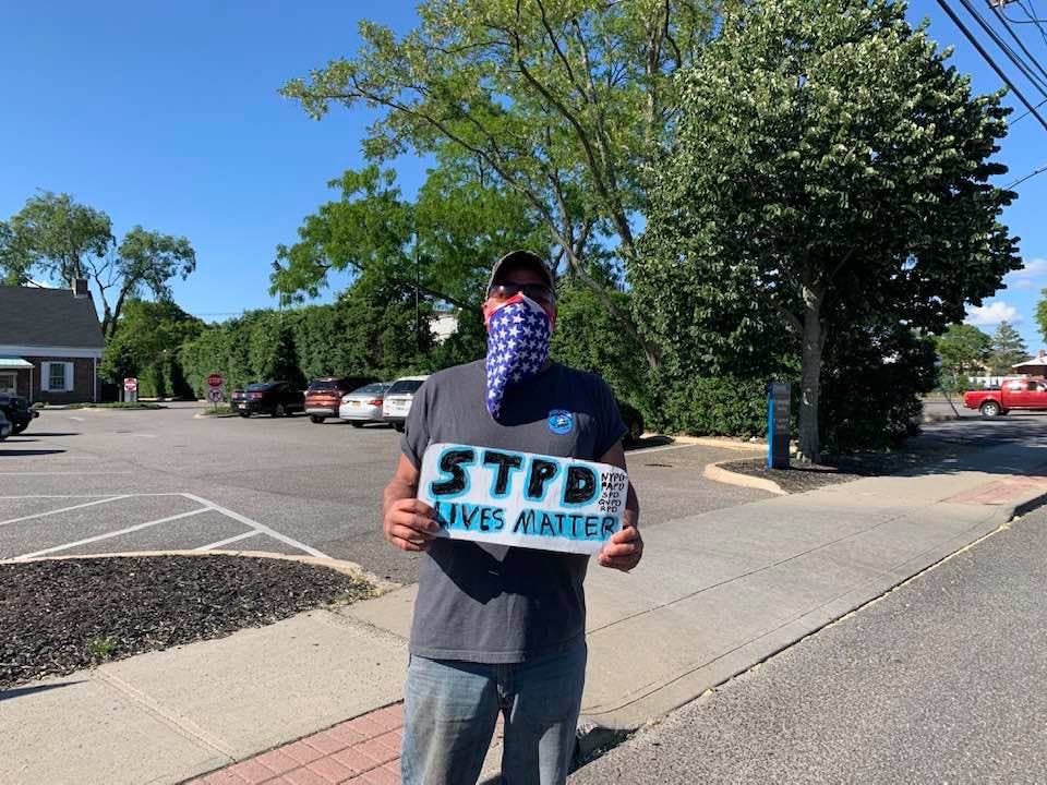 Patrick Coonradt stood alone before the train station, holding a sign that said "STPD Lives Matter" for the Southampton Town Police Department. A lifetime Hampton Bays resident, he said he was friends with many in the crowd. "All lives matter. So do the police in my town. That's why I'm here."