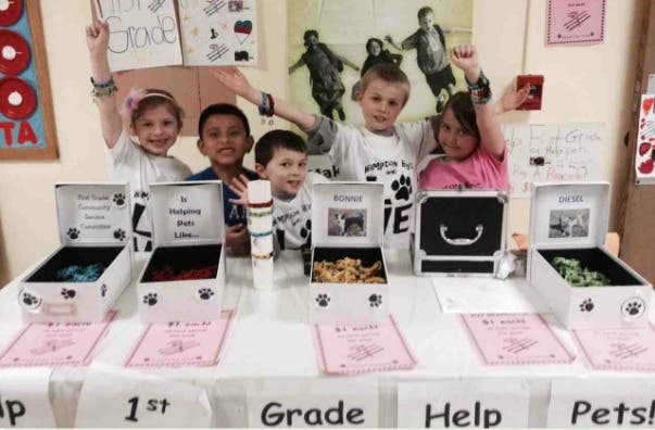 As part of a new first-grade community service committee, 70 first graders at Hampton Bays Elementary School teamed up to raise $800 for the Southampton Animal Shelter.