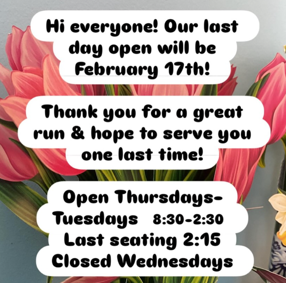 Eckart's will be open through Feb. 17, from Thursdays to Tuesdays, 8:30 a.m. to 2:30 p.m., with a last seating at 2:15 p.m. Closed Wednesdays.