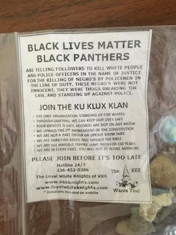 Resident Alison Akant, who works as a diversity consultant, lives on Beach Lane and said her husband drove into the driveway Sunday when he noticed a little sandwich sized baggie containing colorful rocks and a flyer from the KKK.