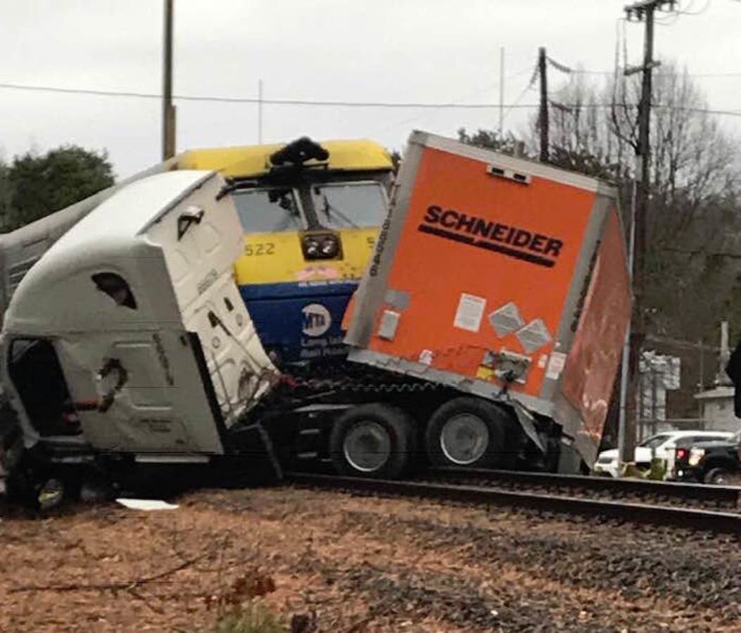 According to an LIRR spokesperson, the 4:41 a.m. train out of Southampton due at Penn Station at 7:02 a.m. struck the tractor-trailer truck at Old Depot Road.