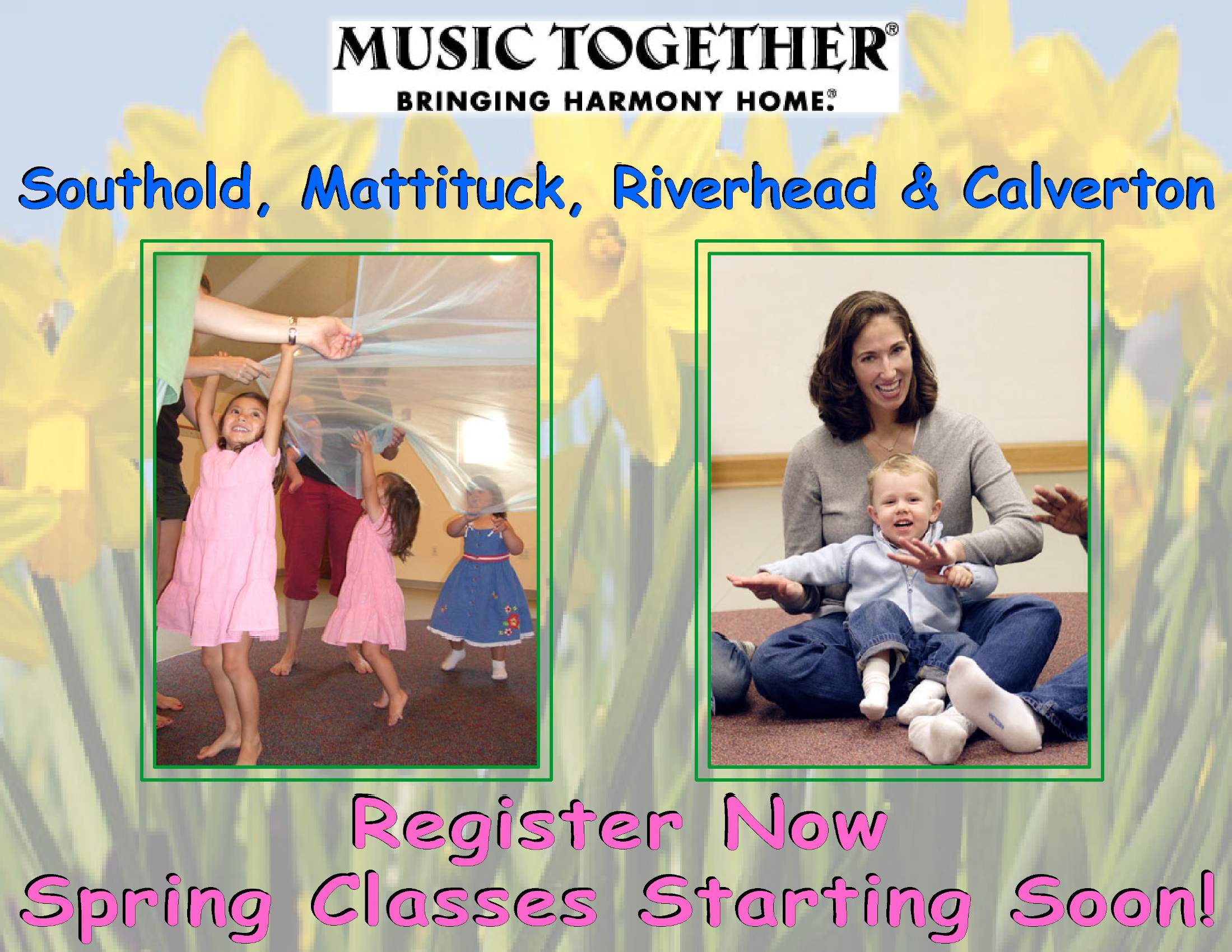 Share "Music Together" with your newborn thru 5 yr old this Spring! Reserve your spot for a FREE DEMO this week.