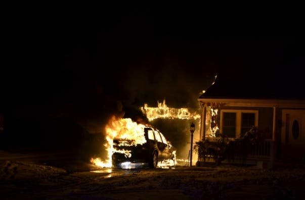 The fire started in the car that was in the driveway before it extended to the side of the building, into the roof’s attic space and behind the knee wall.