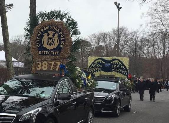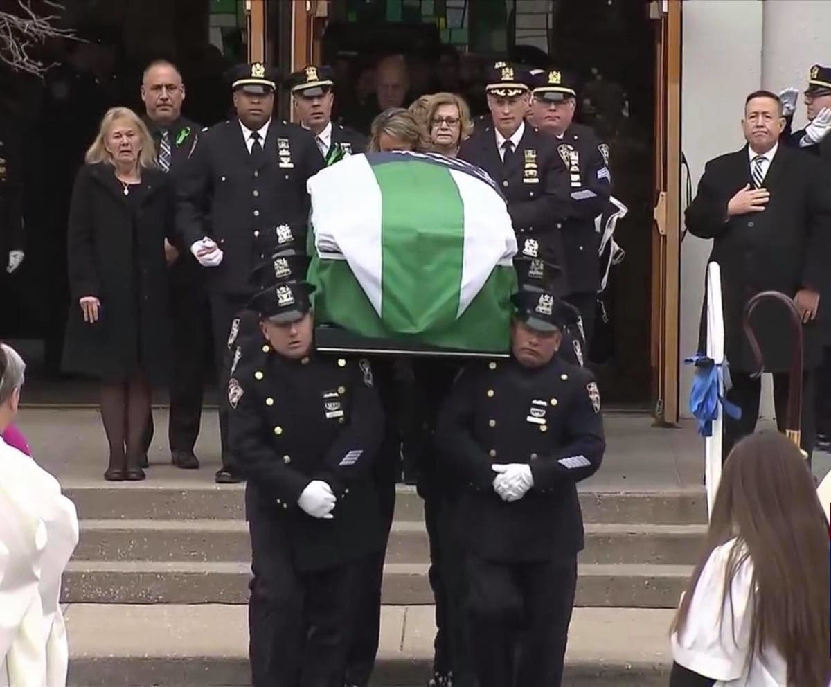 NYPD Chaplain Monsignor Robert Romano presided over the Mass. NYPD Chaplain Monsignor David Cassato gave the homily, and Bishop John Barres of the Diocese of Rockville Centre blessed the casket.