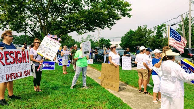 Joyce Roper protested: "I am standing up to Trump and Zeldin because they are working against all the values and principles that America should stand for. Basic dignity for all people, human rights, freedom of the press. We are headed down a dangerous, dark road but we can turn it around if we send a message and vote."