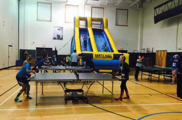During the event, students and teachers played a number of games, including ping-ping and volleyball, as well as jump in a bouncy house and slide down a giant slide.
