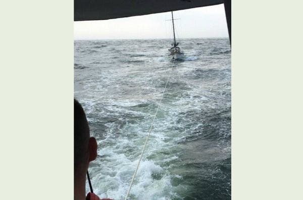 At 8:15 a.m., the Coast Guard received a phone call from a commercial salvage company stating that a 38-foot sailing boat was stuck due to the weather 2 miles from shore and that they were unable to respond.