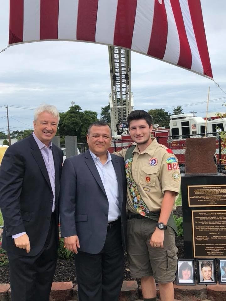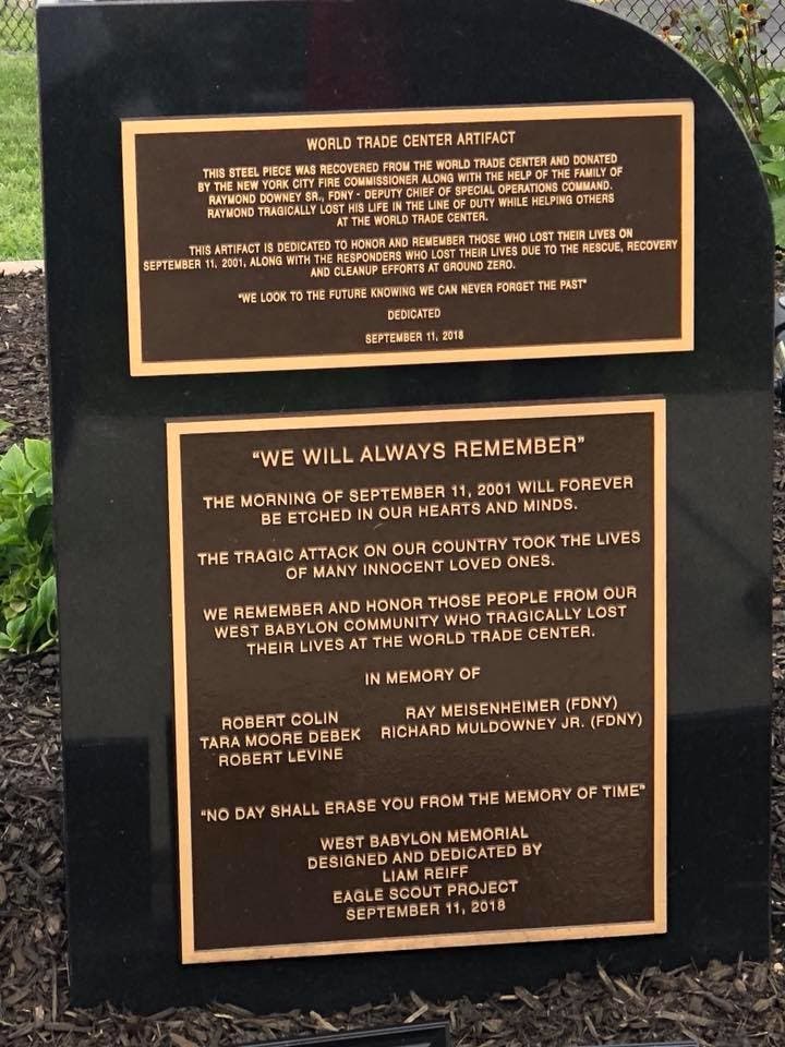 "This morning’s dedication of West Babylon’s 911 memorial at our high was a huge success," the school district wrote in a post on Facebook on Saturday. "Thank you to all who donated their time and/or materials for this heartfelt Eagle Scout project and thank you to all our trustees, administrators, teachers and community members who came to support Liam and honor all who lost their lives on 9/11 or as a result of 9/11."