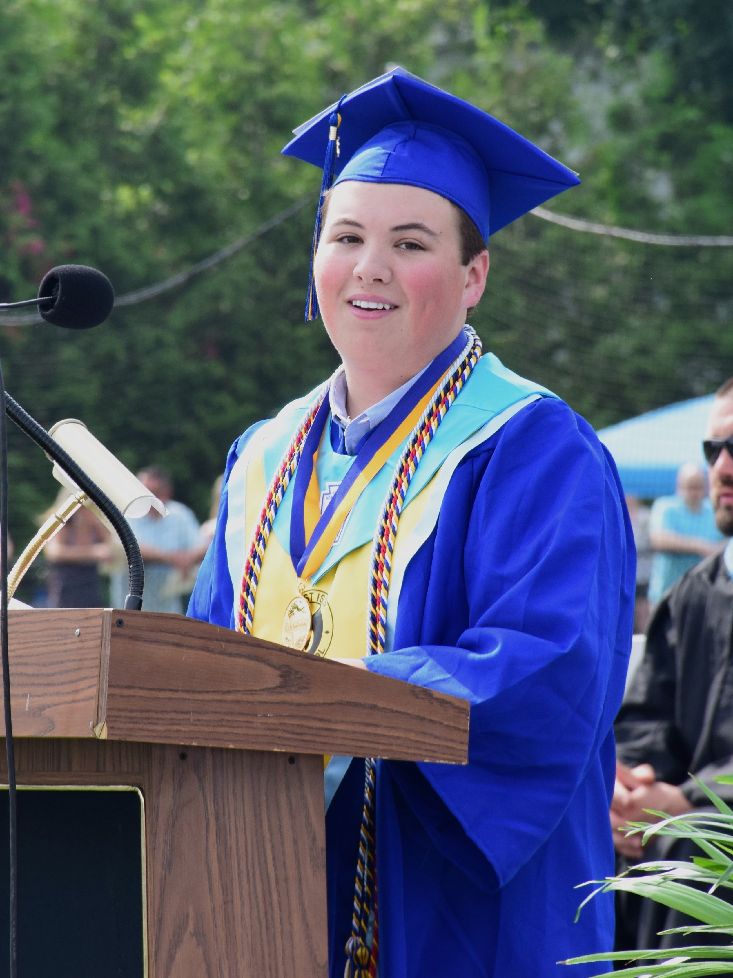 Using the school’s mascot for an overarching theme, salutatorian Douglas Dillman said, "Let me tell you about our jungle, where the Lion is king of all. At first sight it was vast and overwhelming, but the jungle became our habitat, a second home for us all. Once fearful, we now lead by example. In crowded classrooms, under bright stage lights, on sweltering sports fields, we have demonstrated the way a Lion moves – with courage and diligence. I choose to refer to us as one fierce Lion pride."