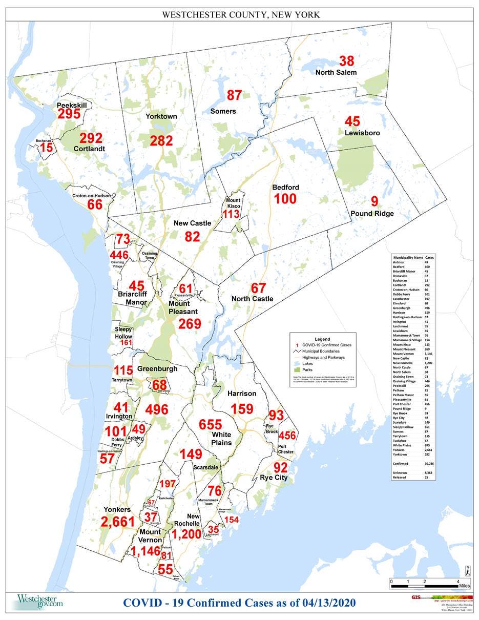 Yonkers leads the county in number of confirmed new coronavirus cases at 2,661. Mount Vernon is second at 1,146, followed by New Rochelle at 1,200. Numbers for other municipalities can be found on the map below.