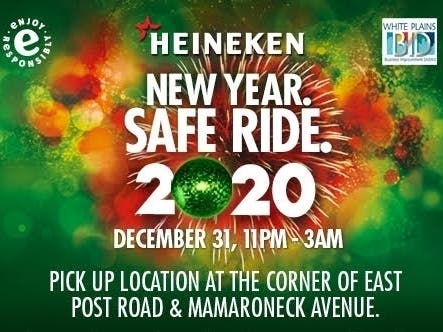 WHITE PLAINS, NY — For the 16th year in a row, Heineken USA, which has its headquarters in White Plains, will be partnering with the City of White Plains and the White Plains Business Improvement District for its "New Year. Safe Ride." program. The program provides free and safe rides home to more than 5,000 Westchester County residents of legal drinking age who celebrate New Year's Eve in downtown White Plains.