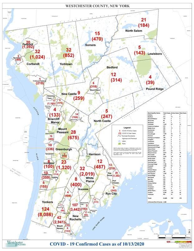 Here is the latest map of Westchester County with the number of coronavirus infections and the number of active cases by community.