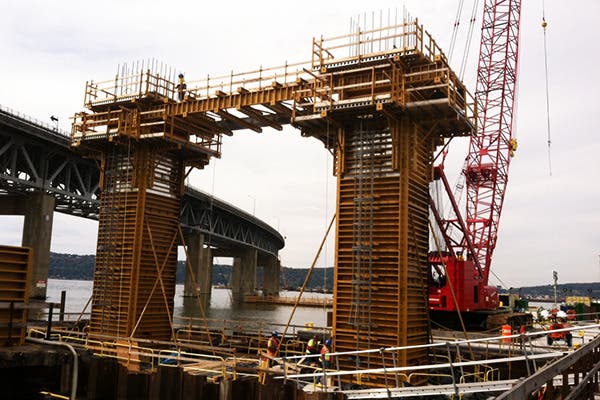 The NY Bridge Project Team marked the occasion with a status update. They also included this fantastic photo of the forms for the first two columns.