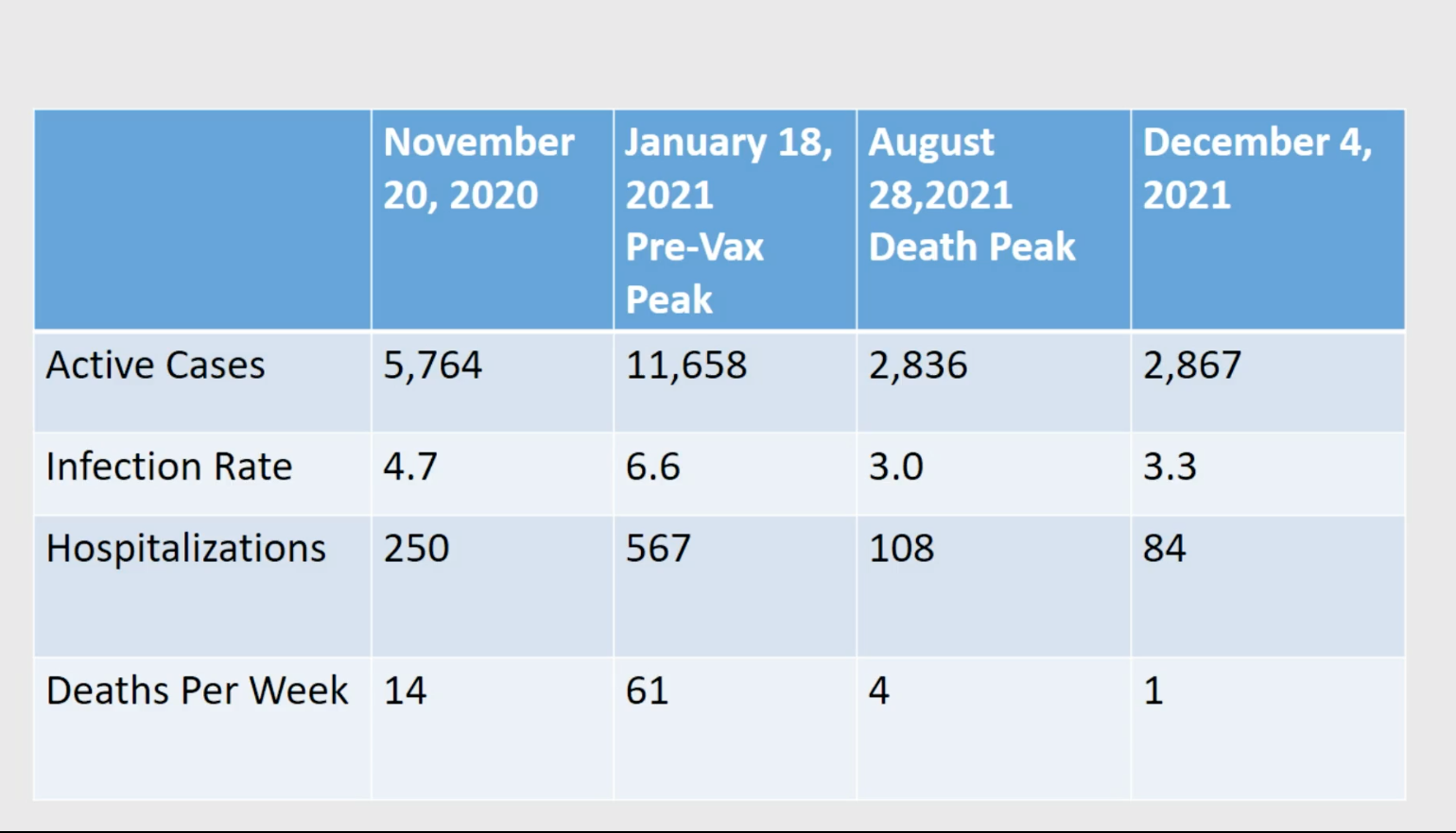 How these four metrics — cases, infection rate, hospitalizations and deaths — change in the next month will determine what actions the county takes as a government, Latimer said, but it may not have to include the kinds of extreme measures that would have been needed without a vaccine.
