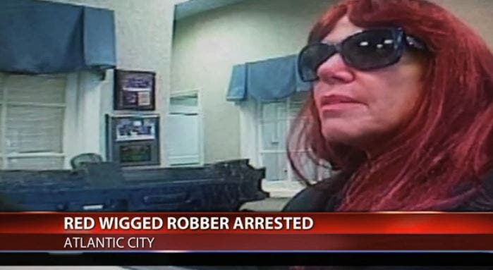 Fios1 News reports that the woman wore a red wig during alleged robberies in Glen Rock, NJ, and Greenwich, CT.