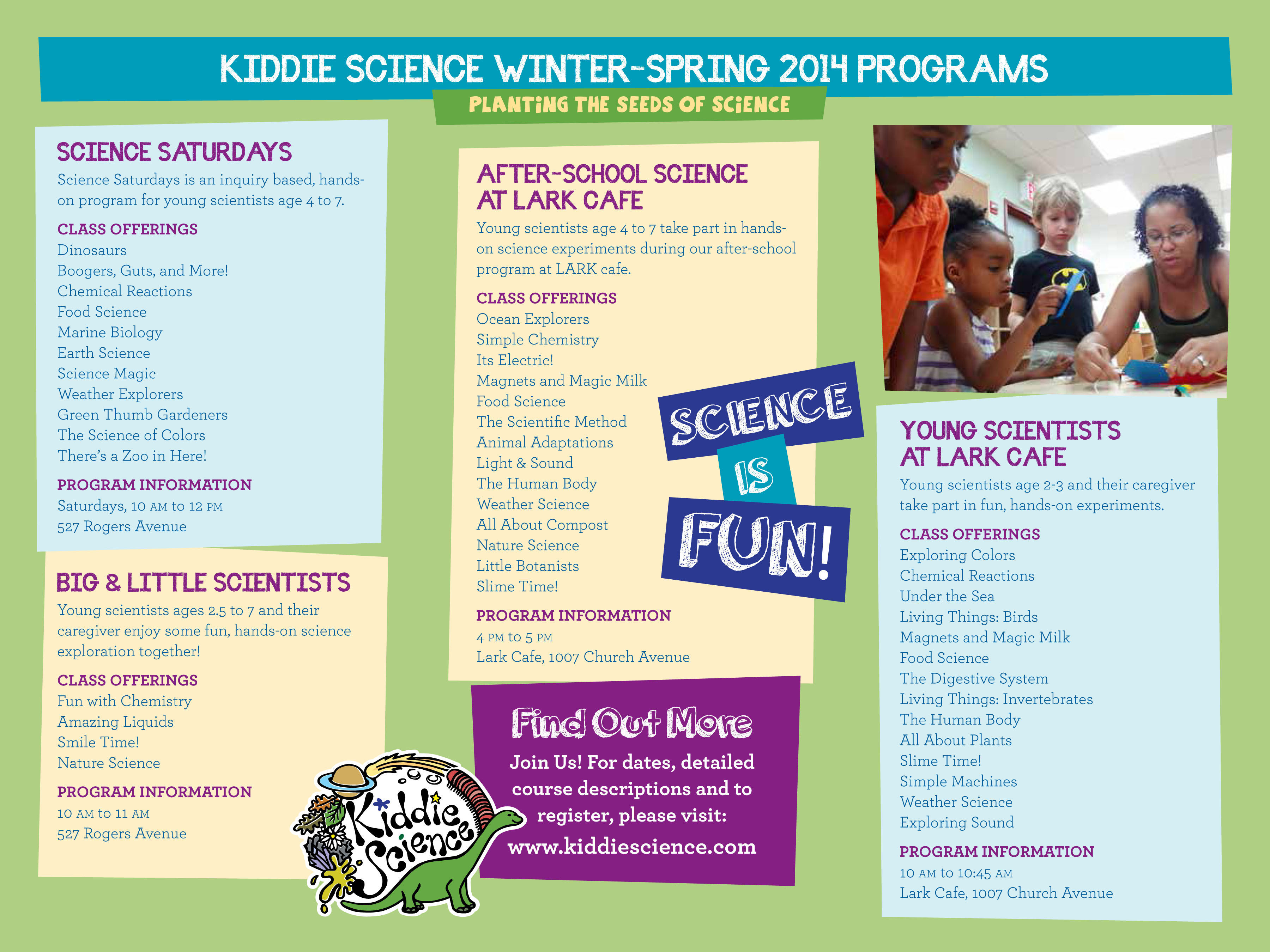 Happy New Year! We have some exciting new programming to share with you! First of all, both Science Saturdays and Science at LARK will continue through the winter and spring. Additionally, we've added Big & Little Scientists, a program aimed at young scientists age 2.5-7 and their adult caregiver. These sessions will allow scientists of all ages to participate in our fun, hands-on experiments. To learn more about our programs and to register your young scientist, visit http://www.kiddiescience.com/Programs.html