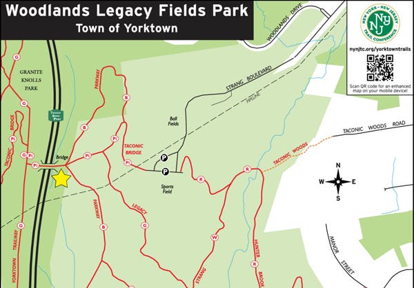 The only pedestrian bridge over the Taconic Parkway links trails in 3 of Yorktown's parks: Woodlands Legacy, Granite Knolls and Sylvan Glen.