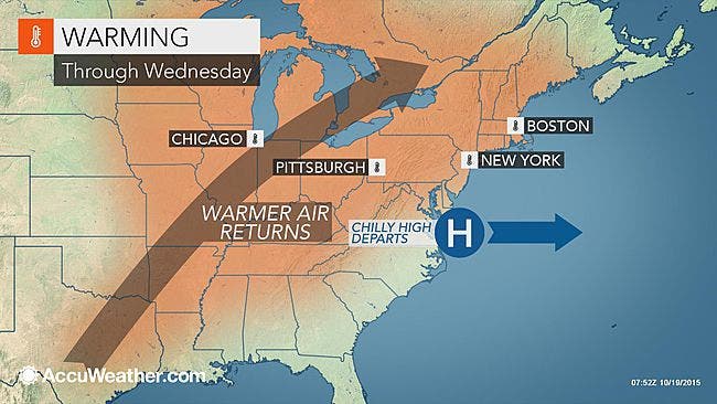 Monday will struggle to climb up to the 50s, forecasters say. But by midweek it will be in the 70s, about 10 degrees warmer than usual. The normal temperature for mid-October is about 10 degrees cooler, in the lower 60s F, according to AccuWeather.com.