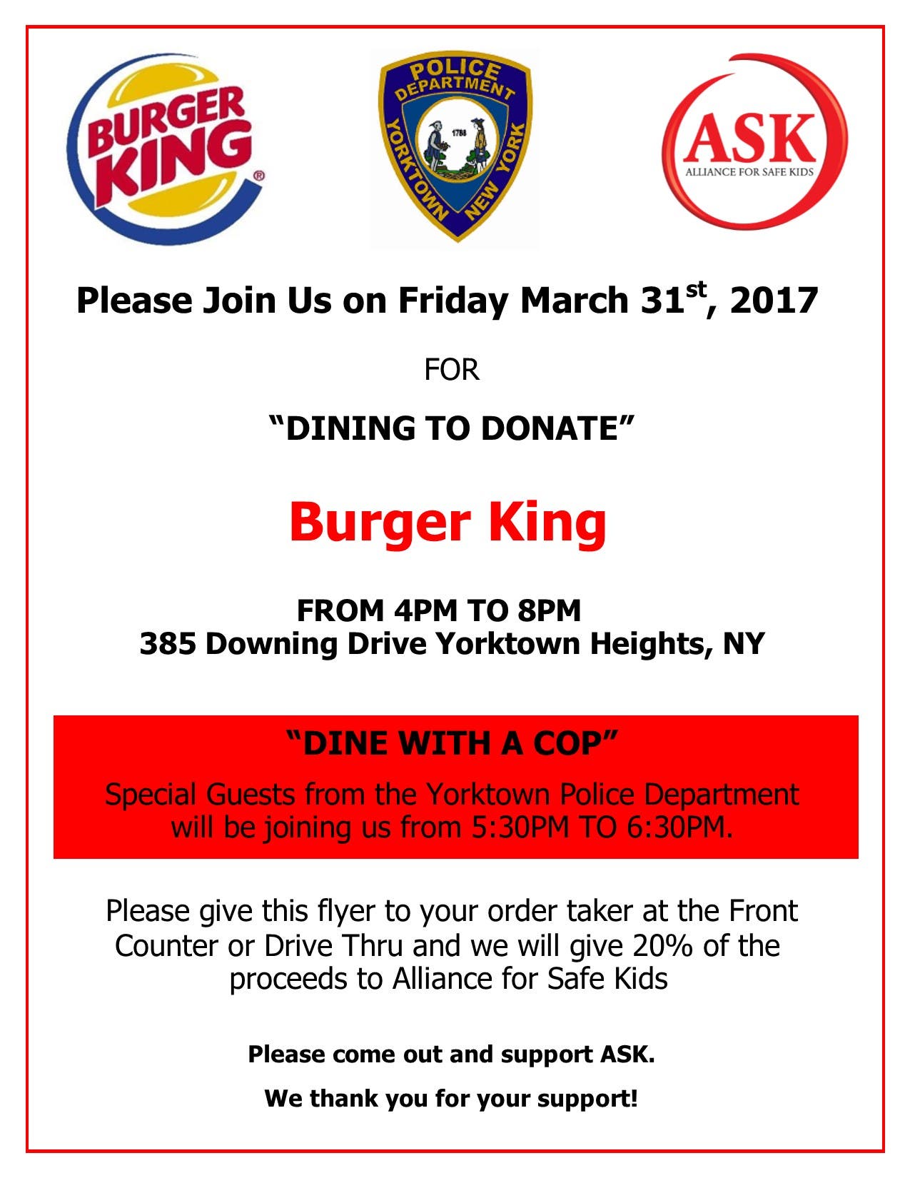 Please join the Alliance for Safe Kids on Friday March 31th, 2017 for “DINING TO DONATE” at Burger King from 4PM to 8PM.