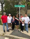 At unveiling of ceremonial street signs in Yorktown Heights, christening the stretch of Commerce Street where the Feast is held "San Gennaro Way," 2018 Grand Marshal Mary Capoccia (center) is flanked by Yorktown Feast of San Gennaro organizers Tom Pomposello (far left) and Michael DiCostanzo (far right). Past Grand Marshals are (from left) Sonny Graci (2015), Dorothea LaScala (2017) and Anthony Grasso (2016). Photo credit: Bruce Apar