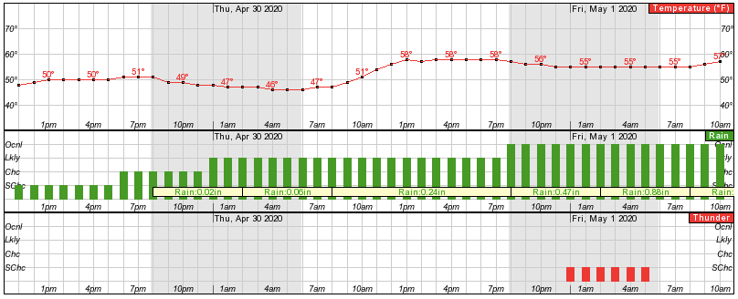 - Thursday Night: Rain, with thunderstorms also possible after midnight. Low around 54. Southeast wind 14 to 16 mph, with gusts as high as 28 mph. Chance of precipitation is 100%. New rainfall amounts between 1 and 2 inches possible.